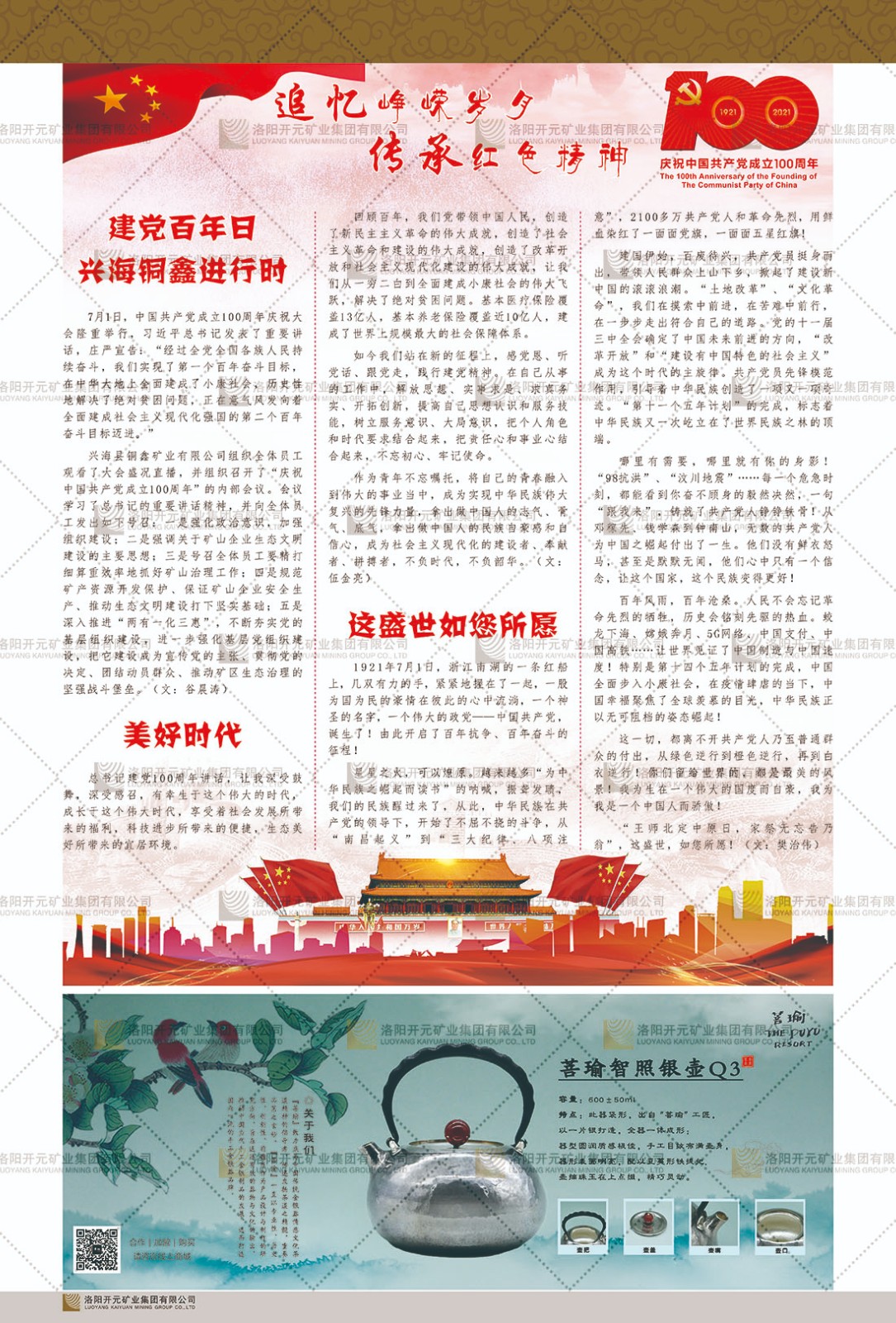 洛陽開元礦業(yè)集團有限公司簡介洛陽開元礦業(yè)集團有限公司,始成立于2006年,位于洛陽市開元大道269號。集團旗下共有五余家全資子公司,業(yè)務(wù)涉及有色金屬礦山開發(fā)、礦產(chǎn)品購銷與進出口貿(mào)易、房地產(chǎn)開發(fā)、文化藝術(shù)、企業(yè)管理與咨詢、資本投資等多個領(lǐng)域。民建河南省委委員、民建河南省委企業(yè)委副主任、民建洛陽市委委員、企業(yè)委主任、洛陽民建企業(yè)家協(xié)會會長許明月是公司創(chuàng)始人,現(xiàn)任洛陽開元礦業(yè)集團有限公司董事長。在礦業(yè)領(lǐng)域,洛陽開元礦業(yè)集團擁有多家實力雄厚的子公司:貴州開元礦業(yè)有限公司探、采礦權(quán)面積共11.33平方公里;興??h銅鑫礦業(yè)有限公司探礦權(quán)面積8.76平方公里,礦山資源潛力巨大;2021年,開元集團與盧氏中科礦業(yè)有限公司開展戰(zhàn)略合作。盧氏中科礦業(yè)有限公司專注于有色金屬的浮選、加工和銷售,擁有強大的技術(shù)支撐平臺,是集探、采、選、冶、研為一體的中大型綜合礦業(yè)企業(yè)。目前,盧氏中科王家河1000噸選礦廠已成功投產(chǎn),雙河金礦、柳關(guān)欒盧鉛鋅礦相繼順利開工,樓房銀礦與圪老灣鉛鋅礦的深部探礦重大突破,標(biāo)志著礦山版圖取得重大進展,為開元集團后續(xù)發(fā)展奠定了堅實基礎(chǔ)。在文化傳媒領(lǐng)域,洛陽市明月美術(shù)館通過豐富多樣的藝術(shù)展覽、學(xué)術(shù)研討和公共教育活動,努力打造一個集展覽、交流、教育、研究為一體的綜合性藝術(shù)平臺。此外,在金融投資領(lǐng)域,開元集團旗下的北京明峰資本管理有限公司專注于投資具有高增長潛力的優(yōu)秀企業(yè),特別是高科技、新能源、環(huán)保等新興產(chǎn)業(yè),為客戶提供個性化的資產(chǎn)配置服務(wù)。在做好企業(yè)經(jīng)營的同時,開元集團始終不忘企業(yè)的社會責(zé)任和家國情懷,以突出的愛心公益事跡,開展了一系列公益慈善活動:“民建林”公益事業(yè)通過“思源基金”“幫幫公益”線上公益平臺,與眾多愛心人士籌措資金20余萬元;資助541名貧困大學(xué)生共計270余萬元,推進“數(shù)字助力——河南AI人才培養(yǎng)”;捐款10萬元,馳援京津冀、黑龍江洪水地質(zhì)災(zāi)害……公司于2017年底被洛陽市慈善總會評為“洛陽慈善風(fēng)云榜——十大愛心集體”。洛陽開元礦業(yè)集團有限公司秉承持續(xù)發(fā)展理念,憑借多年來良好的企業(yè)信譽與經(jīng)營業(yè)績,與全國多家企業(yè)建立了良好合作關(guān)系,受到社會各界的一致好評,多次榮獲“納稅標(biāo)兵”“先進企業(yè)”“招商引資模范企業(yè)”等榮譽稱號。回望來時路,開元人勠力同心,以“闖”的精神和“創(chuàng)”的勁頭,一路披荊斬棘,踏過千山萬水;展望新未來,開元人凝心聚力,不執(zhí)于“舊”,無畏于“新”,秉承“勇于跨越,追求卓越”的企業(yè)精神,乘著國家高質(zhì)量發(fā)展新征程的東風(fēng),跨過高山,越過大海,向著集團多元化、國際化的目標(biāo),逐夢遠(yuǎn)航,跨越前行!